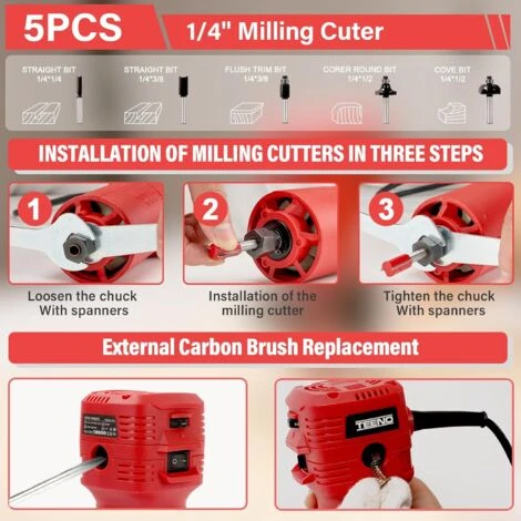 【Un cadeau parfait】1xDéfonceuse à Bois,1 × guide droit,1 × guide à bord incurvé,5 × fraise(1/4 »), 2 x carbone brosse, 2 × clé,1 × levier,1 x Instruction.