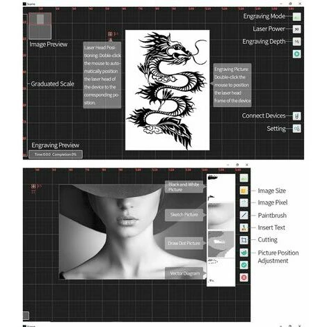 Autres fonctions – Algorithme de traitement de fichiers professionnel, le logiciel peut restaurer votre conception 1: 1 sans perte sur chaque pixel. Une variété d’algorithmes d’image présentent mieux les caractéristiques d’image des membres de votre famille, de vos amis ou de vos idoles. Vous pouvez effectuer les modifications complexes dans PS/Inkscape/CAD ou similaire et simplement graver avec le programme inclus.