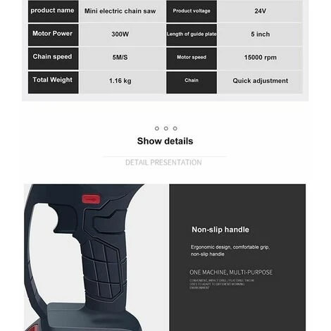 - 4. conception ergonomique: la conception de la poignée antidérapante est très confortable à tenir. Linterrupteur de la scie électrique peut ajuster la vitesse en fonction de la force, et la vitesse de coupe nécessaire peut être ajustée en fonction des conditions de fonctionnement.