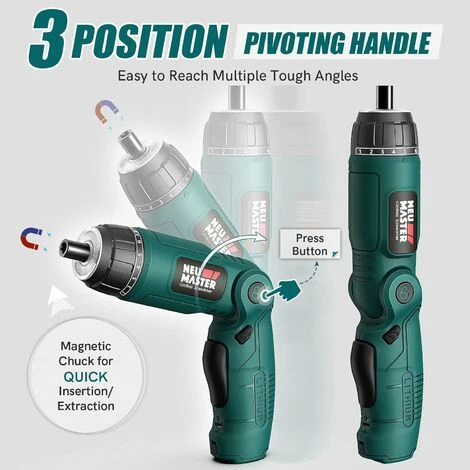 Poignée rotative et support de foret magnétique: tournevis rechargeable avec poignée rotative réglable à trois voies pouvant être actionnée en ligne ou en pistolet. Il est ergonomique et peut être adapté à la forme de votre main. Confortable à tenir. Le support de tournevis magnétique 6mm vous permet de changer rapidement les accessoires attachés, ce qui rend le travail sûr, flexible et facile.