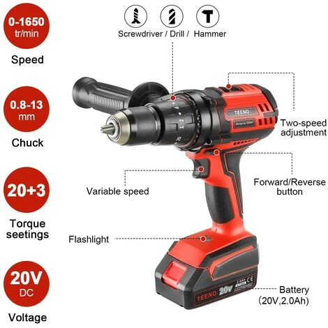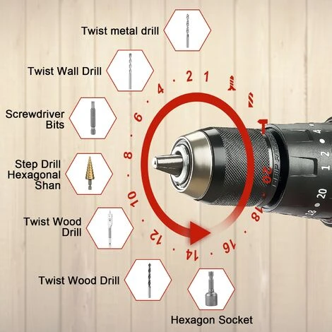 [CONTENU DE L’EMBALLAGE] –1 Perceuse-visseuse sans fil 20V, 1xmanipuler, 14 x Embouts, 5x embouts de vis, 4xsix pans creux, 2 x batteries 2000mAh, 1 x chargeur,, 1 x boîte en plastique, 1 x manuel d’utilisation.