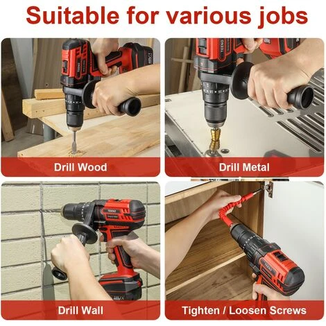 [20+3 RÉGLAGES DE COUPLE&45Nm] Fonction trois-en-un : perceuse, visseuse et perceuse à percussion ; 20 positions de réglage du couple, contrôle optimal lors des opérations de perçage et serrage/dévissage. Le couple maximal de la vis est de 45 N.m, Idéal pour toutes les fonctions de perçage des murs, du bois, du métal, du plastique et du béton. Le mandrin en métal de 13 mm maximum permet de percer des trous plus grands pour répondre à des exigences de travail plus élevées.