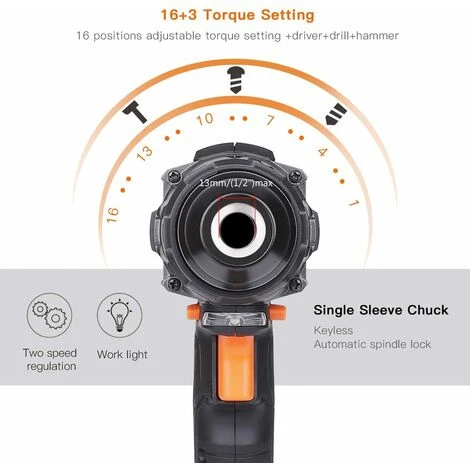 ⚒[45 Nm Max] : Fournit une gamme de puissance de 5-45 Nm et 2 vitesses : 0-450 tr/min et 0-1600 tr/min, respectivement. Le bouton de vitesse situé sur la poignée permet également de régler la vitesse par simple pression. 16 réglages de couple vous permettent de contrôler la puissance. Conseil : pour percer des trous dans différents matériaux, veuillez noter qu’il faut utiliser un foret adapté.