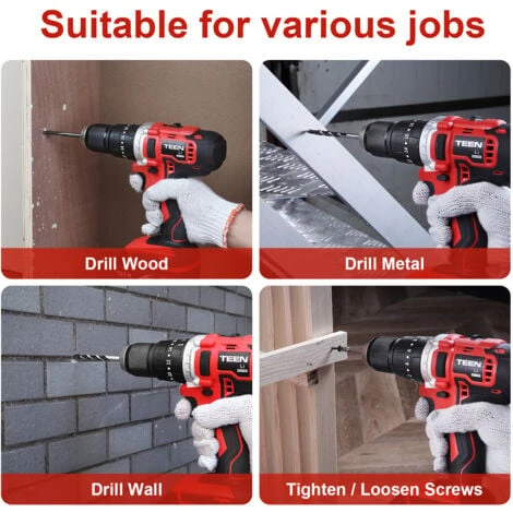 [ Travail Plus Efficace avec 2 Batteries ] – 2 batteries de 2,0 Ah peuvent être rechargées rapidement, en 1 heure; Perceuse Percussion Sans Fil TEENO fournit 45Nm de couple max